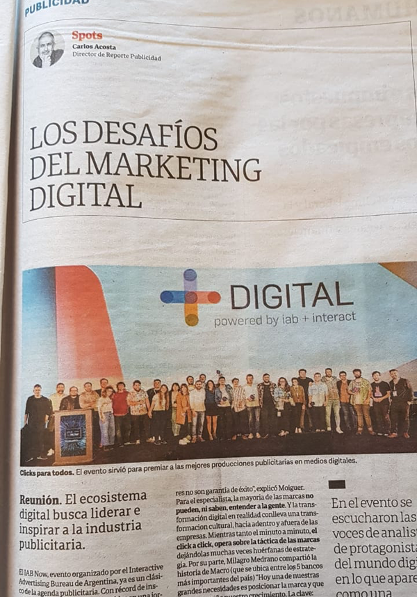 Por Carlos Acosta para Clarín 1/9/19. El IABNOW, evento organizado por el Interactive Advertising Bureau de Argentina ya es un clásico de la agenda publicitaria. Con récord de inscriptos y más de 40 charlas reunidas en una jornada, el ecosistema digital local tuvo su encuentro con el objetivo de “liderar e inspirar a la industria publicitaria en la transformación digital de la Argentina” según su presidente Gervasio “Bachi” Marques Peña, Director Comercial de La Nación.