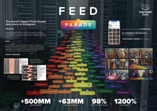 En la tercera jornada de premios del festival internacional de creatividad, “Feed Parade” para Mercado Livre Brasil de Gut San Pablo se alzó con uno de los dos Grand Prix de Entertainment Lions for Music entregados esta mañana; La marca encontró una manera de celebrar el desfile a pesar de la pandemia. Convirtió los 2,5 metros de la avenida donde tradicionalmente se realiza el desfile en un feed de Instagram. Se invitó a las personas a etiquetarse en él y Gloria Groove, la legendaria cantante y activista LGBTQIA +, lanzó un video musical con el nombre de cada persona que se sumó en Instagram.