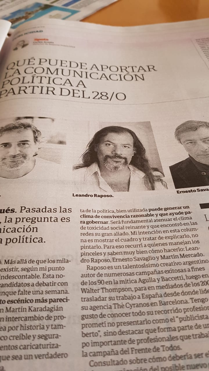 Raposo es un talentosísimo creativo argentino, autor de numerosas campañas exitosas a fines de los 90 en la mítica Agulla y Baccetti, luego en J. Walter Thompson, para en mediados de los 2000 trasladar su trabajo a España desde donde lidera su agencia The Cyranos en Barcelona. Tengo el gusto de conocer todo su recorrido profesional y prometí no presentarlo como el “publicista de Alberto”, como hicieron otros medios, sino destacar que forma parte de un grupo importante de profesionales que trabajan en la campaña del Frente de Todos. Consultado sobre cómo debería ser el aporte de la comunicación del posible nuevo gobierno para comenzar a cerrar la grieta expresa: “Lo primero que creo que debería hacer la comunicación es rebelarse y cambiar la metáfora de grieta. Porque las grietas son insalvables, externas, lugares donde uno necesita como nada a los que quedaron de su lado y no necesita para nada a los de enfrente”. Para Raposo lo que nos pasa no es un designio geológico y es algo que depende de nosotros resolver. Y suma: “El otro enfoque es pensar realmente desde la comunicación si esta grieta imaginaria que creemos que nos divide a mitades prácticamente exactas, es realmente así o forma de parte de una construcción. Tal vez nos demos cuenta hablando a fondo, que en la mayoría de los temas la grieta está entre el 2 por ciento de la población y el 98 que somos todo el resto. La igualdad de oportunidades y la igualdad ante la ley, los derechos adquiridos por nuestros abuelos después de muchas luchas, el derecho no solo a comer, sino que dentro de nuestras posibilidades podamos acceder a cierta felicidad y tranquilidad, la dignidad de la vejez y la esencialidad de cuidar a absolutamente todos los pibes. Lo que significa la soberanía en el sentido menos acartonado de la palabra. ¿Realmente creemos que en eso estamos divididos a mitades? ¿O son unos muy pocos de un lado y del otro todo el resto? Tal vez más que seguir hablando de grietas, haya que empezar a hablar de los temas importantes y concretos. Y ahí nos demos cuenta de que si el 98 por ciento estamos de acuerdo, no existe una grieta real en los temas importantes.”