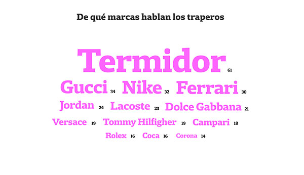 El especial multimedia permite escuchar un ritmo rápido, intermedio o lento mientras se lee; entender términos como blunt, crew y mamichula gracias a un diccionario trapero; abandonar prejuicios con el testimonio de investigadores y musicólog@s; divertirse con el “egómetro” que tiene a Duki e Ysy A como reyes indiscutidos de las auto-menciones; o sorprenderse con que Termidor es la marca fetiche de las canciones, por encima de íconos como Gucci, Nike y Ferrari. Quizá el aporte más original sea un “Laboratorio de Trap” que, mediante una serie de comandos de ecualización, permite jugar con variables como energía, bailabilidad y tempo para descubrir el tema que más se ajusta al gusto propio.