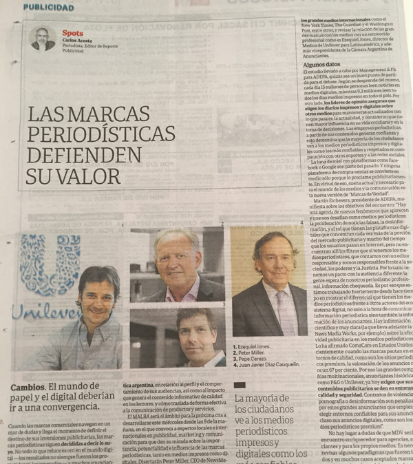 El MALBA será el ámbito para la próxima cita a desarrollarse este miércoles desde la 9 de la mañana en el que convoca a expertos locales e internacionales en publicidad, marketing y comunicación, para que den su mirada sobre la importancia, potencialidad e influencia de las marcas periodísticas, tanto en medios impresos como digitales. Disertarán Peter Miller, CEO de NewsMediaWorks (Australia); Juan Javier Díaz Cauquelin, presidente de la Asociación Nacional de la Prensa (Chile); Pepe Cerezo, director de la Consultora Evoca (España); Marcos Christensen, director de T4D; Silvina Seiguer, presidenta de la Asociación DIRCOM; Cecilia Mosto, Socia CIO Investigación; y Leónidas Rojas, responsable de la estrategia de ComScore en Latinoamérica Cono Sur. Yo tendré la posibilidad de compartir con el auditorio las mejores campañas publicitarias de los grandes medios internacionales como el New York Times, The Guardian y el Washington Post, entre otros, y revisar la relación de las grandes marcas con los medios con un reconocido profesional como es Ezequiel Jones, Director de Medios de Unilever para Latinoamérica, y además Vicepresidente de la Cámara Argentina de Anunciantes. El estudio llevado a cabo por Management & Fit para ADEPA, en Argentina quizás sea un buen punto de partida para el debate. Según se desprende del mismo cada día 15 millones de personas leen noticias en medios digitales, mientras 9,3 millones leen todos los días medios impresos en todo el país. Por otro lado, los líderes de opinión aseguran que eligen los diarios impresos y digitales sobre otros medios para mantenerse actualizados con lo que pasa en la actualidad, y consideran que tienen mayor influencia en su vida cotidiana y en la toma de decisiones. Las empresas periodísticas, a partir de sus contenidos generan confianza y esto determina que la mayoría de los ciudadanos ven a los medios periodísticos impresos y digitales como los más confiables y respetados en comparación a otros soportes y a las redes sociales. La luna de miel con plataformas como Facebook o Google son parte del pasado. Y ninguna plataforma de compra-ventas se convierte en medio sólo porque lo proclame publicitariamente. En virtud de ello, nada más actual y necesario para el mundo de los medios y la comunicación que esta nueva versión de “Marcas de Verdad”.