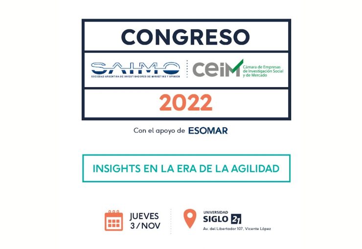 Es una era sin precedentes, con nuevos temores e incertidumbre, el nuevo paradigma plantea desafíos e interrogantes para la producción de insights ágiles y accionables. Este jueves 3 en la Universidad Siglo 21 tendrá lugar el congreso organizado por SAIMO (Sociedad Argentina de Investigadores de Marketing y Opinión) y CEIM (Cámara de Empresas de Investigación Social y de Mercado) que buscará compartir visiones y respuestas a partir de investigaciones recientes y voces expertas de utilidad para empresas, gobiernos y profesionales organizado en tres ejes temáticos: insights ágiles, insights con propósito e insights para el mundo de hoy. El evento cuenta con el apoyo de ESOMAR.