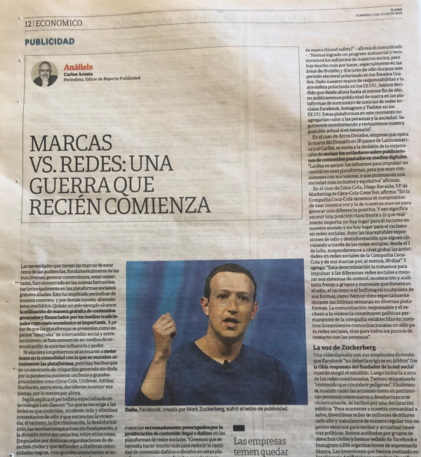 Ni siquiera los gobiernos se animaron a meter mano en la comodidad en las que se manejan actualmente las plataformas, pero hay hechos que en un escenario de crispación generado sin duda por la pandemia pusieron un freno y grandes anunciantes como Coca-Cola, Unilever, Adidas, Starbucks, entre otros, decidieron levantar sus pautas, por lo menos por ahora.