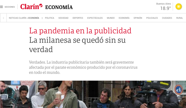 ¿Cómo se refleja esto en nuestro país? ¿Se sintió el parate? ¿Hay nuevos proyectos? ¿Surgieron otras oportunidades? Victoria Cole, CEO de Wunderman/Thompson Argentina, la agencia más grande del país, afirma que siente la merma. “En nuestro caso tenemos un cliente grande que es una aerolínea y una importante cadena de cines, o sea dos industrias con muchos problemas hoy. Así que es lógico que bajen y estamos acompañándonos mutuamente. También nacen oportunidades de trabajar más que nunca para el mercado de USA o UK, por capacidad, experiencia y costos, no sólo en producción sino también en creatividad. ¿Cómo lo vive la agencia? Con mucha vitalidad, compañerismo, viendo clientes que suben otros que bajan y tratando de acompañar a todos”.