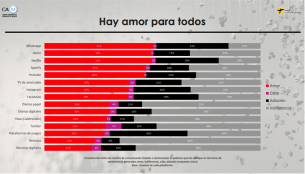 En la última investigación que hicimos en la Cámara Argentina de Agencias de Medios (CAAM) hay un cuadro muy interesante sobre el amor de las personas hacia los diferentes sistemas de medios, en el que se refleja que hay amor para todos.